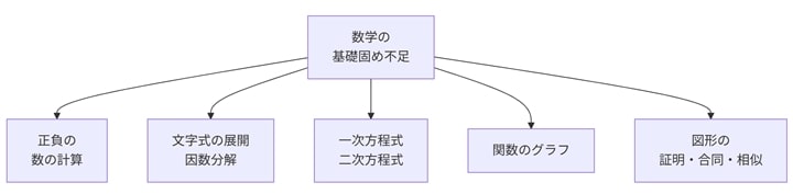 数学の基礎固めが不足している場合、以下のような単元でとくにつまずきやすくなります。どれも基本的な理解が前提となっており、土台が弱いと応用問題に取り組むことが難しくなります。