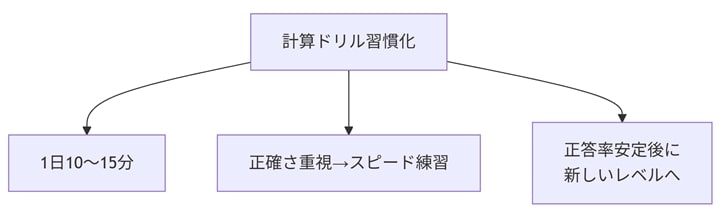 - 毎日5〜10分程度、四則演算や分数計算を反復する