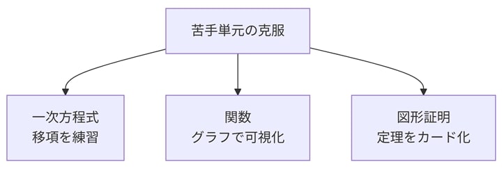 このように苦手単元を整理して復習することで、効率よく数学の基礎固めを進めることが期待できます。