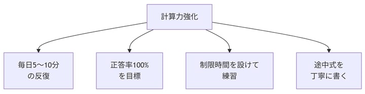 計算力が不足すると、正しい解法を知っていても最後の答えを間違えてしまうことが多く、得点につながりません。効果的な取り組み方は以下の通りです。