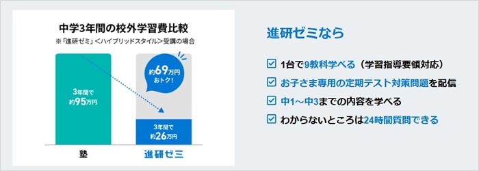 「進研ゼミ中学講座」は、紙教材とデジタル教材を組み合わせたスタイルで、中学生が幅広く取り組みやすい通信教育です。