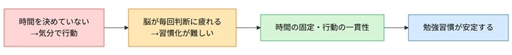このように「時間の固定」と「行動の流れの一貫性」を作ることで、勉強習慣の定着がぐっと進みます。