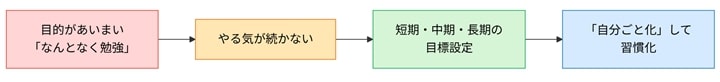 長期目標 | 「志望校合格」「得意科目を増やす」 | 日々の勉強に意味づけが生まれる |