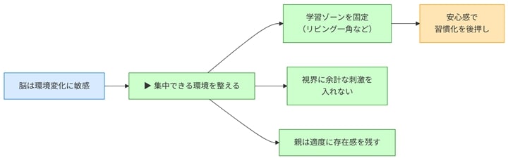 たとえば、リビングの一角を「学習ゾーン」として固定したり、視界に余計な刺激(テレビ・スマホ・おもちゃなど)を入れない工夫をすることが効果的です。