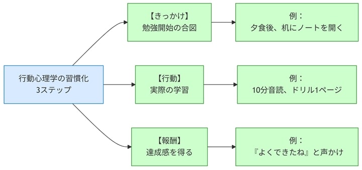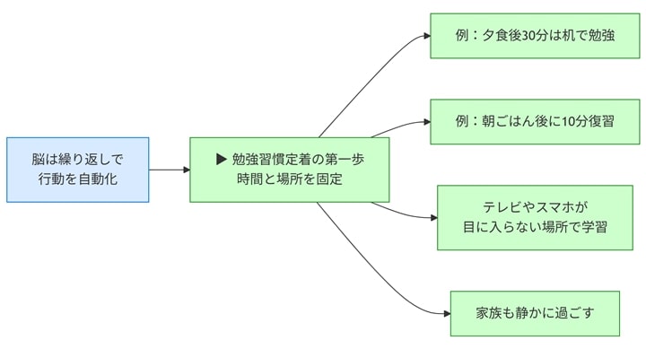 このように生活リズムの中に「固定されたトリガー(合図)」を組み込むことで、勉強習慣は無理なく定着していきます。
