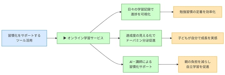 サイト内でも紹介しているように、勉強習慣の定着に特化したオンライン学習サービスを活用するのも効果的です。