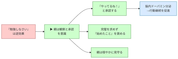 子どもが自分から勉強を始めた瞬間に「今、自分で始めたね。すごいね」と声をかけるだけでも、脳内のドーパミンが分泌され、行動の継続が強化されます。