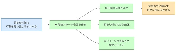 脳は「特定の刺激」を受けると、それに続く行動を思い出しやすくなります。この仕組みを利用して、勉強の“スタート合図”を作るのが効果的です。