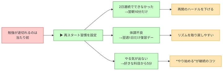 勉強習慣を定着させる過程で、一度や二度サボってしまうのは当たり前。大切なのは「途切れたあと、どう戻るか」をあらかじめ決めておくこと。これを「再スタート習慣」と呼びます。